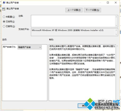 5、双击打开“禁止用户安装”,并且在弹出的禁止用户安装窗口中点击选择“已启用”,然后点击确定完成设置。