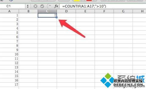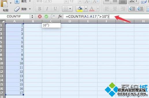 5、接着输入完公式的胜于部分,最终的公式是:=COUNTIF(A1:A17;">10")。