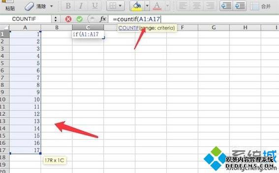 4、输入上面的字符后,excel识别出这是一个函数,提示我们选择统计的区域,我们用鼠标在A1到A17上选中。