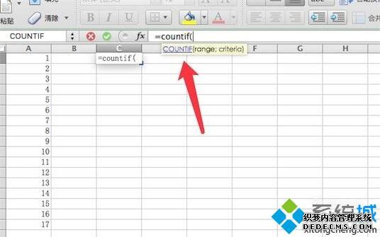 3、在上方的公式栏里输入:=countif(。