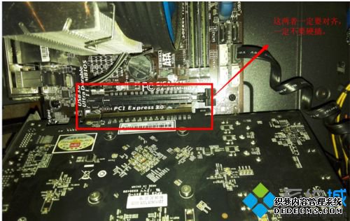 4、插新显卡。将显卡的插条与主板上面的插槽对齐,然后慢慢插进去,在这过程中一定不要硬来;