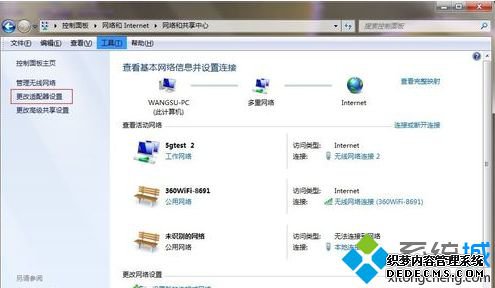 2、进入网络和共享中心,然后我们选择更改适配器设置;