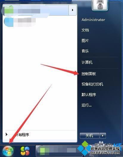 2、在左下角位置点击开始菜单并选择控制面板,如图。