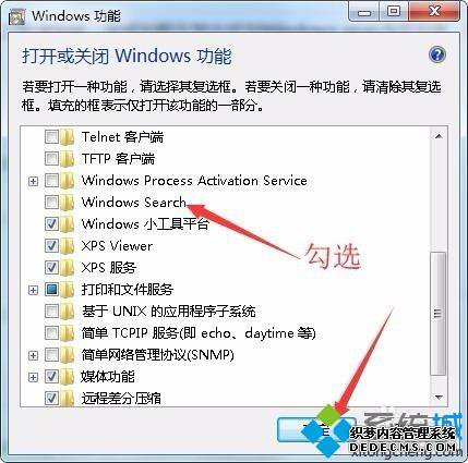 5、加载过程请稍候,完成加载在其中找到Windows search并勾选。然后确定,如图。